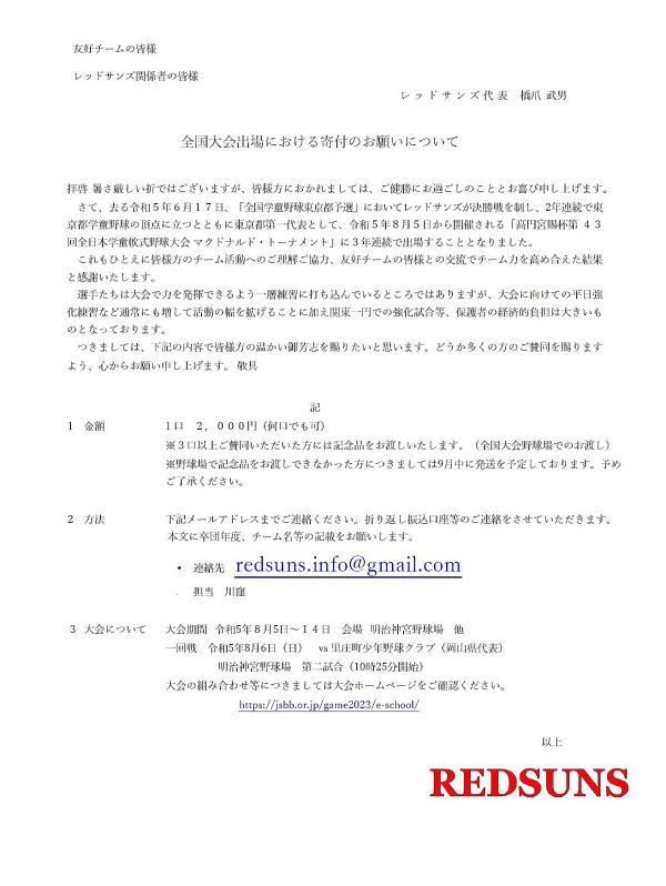 レッドサンズでは常に部員を募集しています。興味のある方、我こそはと思う方、まずは野球を体験してみいませんか? はじめての方は体験入団をお勧めします。練習のある時はいつでも宮下公園に朝8時に集合しています。運動のできる服装で来ていただければ親切に指導いたします。 練 習 日 土・日・祝日 練習場所 宮下公園・六義園・後楽公園・その他 野球をやって身に付くこと ※ 新入部員を募集しています。宮下公園にてに体験会を行いますのでご参加ください。 |